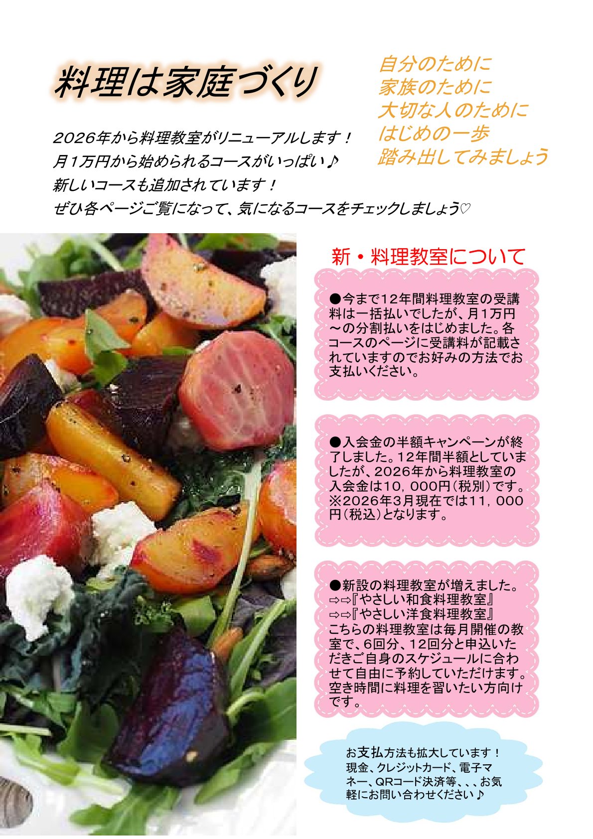 | | 2026年4月新設の料理教室です。やさしい和食・洋食の両方から6回分好きなメニューや日程で習えます。 |