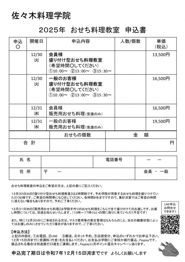 ご予約、お支払いともに12月15日㈪までとなっています。お早めにお申し込みお待ちしております。 別途、販売用のおせち料理もあります。