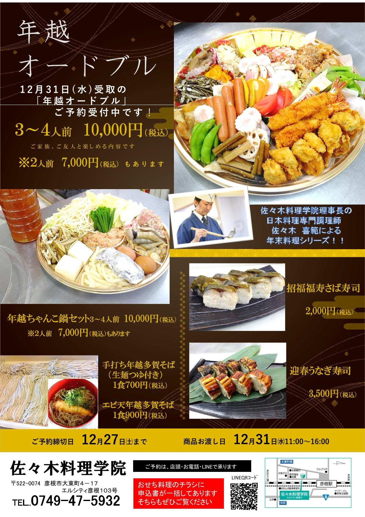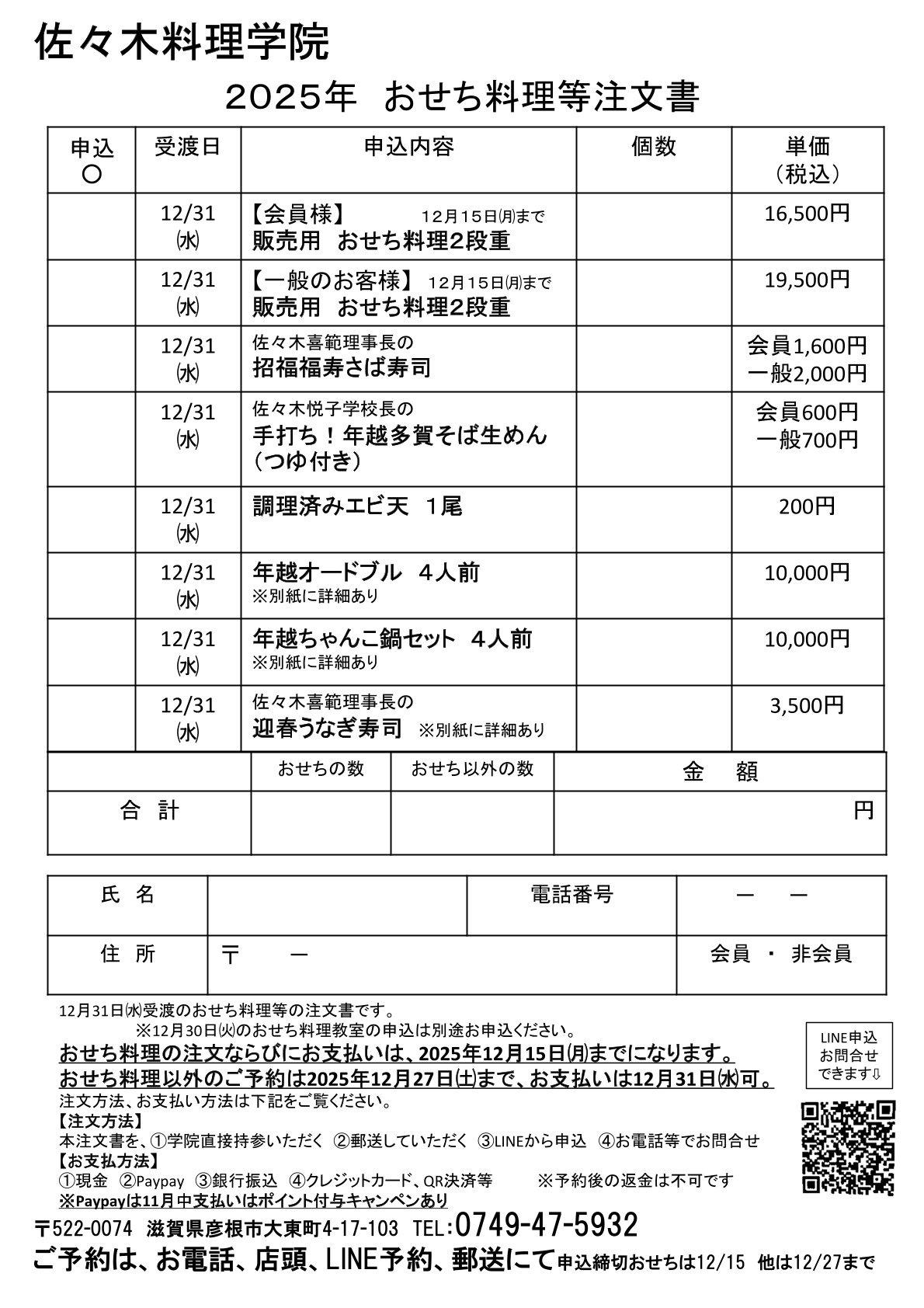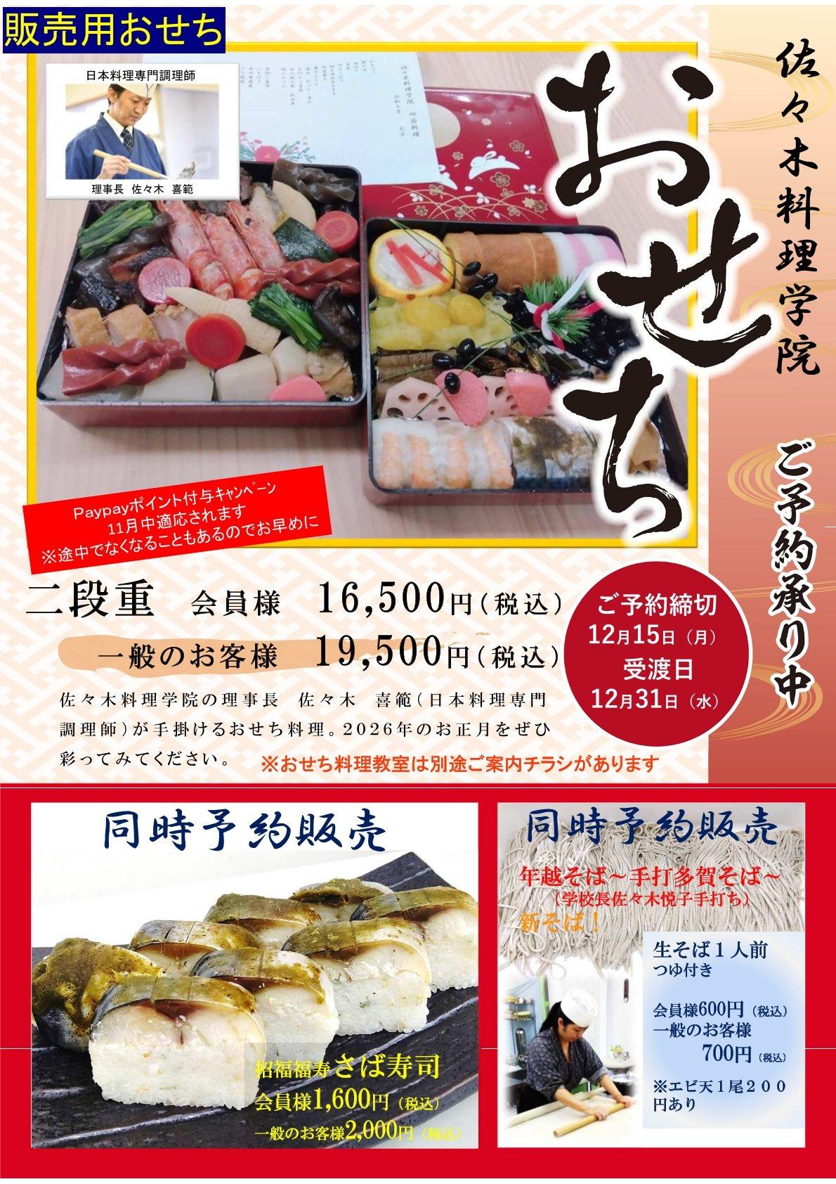 ご予約、お支払いともに12月15日㈪までとなっています。お早めにお申し込みお待ちしております。 別途、おせち料理教室もあります。